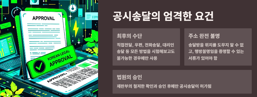 공시송달은 최후의 수단입니다. 즉, 다른 모든 방법(직접전달, 우편, 전화송달, 대리인 송달 등)을 시험해보고도 불가능하다면 마지막으로 쓸 수 있습니다. 이때 중요한 요건은 매우 명확합니다.