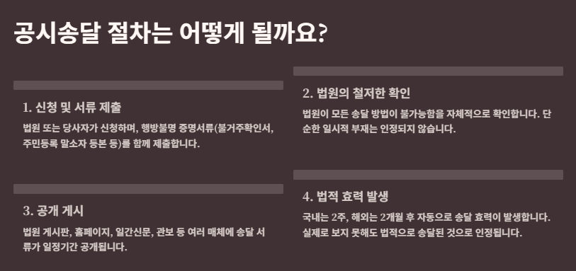 최근엔 전자법원 시스템 덕분에 홈페이지 게시로 더욱 간편·확실하게 진행되고 있습니다. 다만, 주소를 숨긴 경우 등엔 법원이 허가하지 않으므로, 모든 과정이 법적 확인과정 후에 진행된다는 점을 기억해야 합니다.