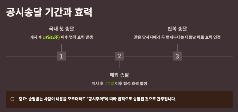 공시송달 이후엔 서류를 실제로 받지 못했더라도 법적으로 송달된 것으로 간주되어 판결이 확정될 수 있으므로 당사자 입장에서는 반드시 공시송달 게시 여부를 주기적으로 확인하는 습관이 중요합니다.🔥