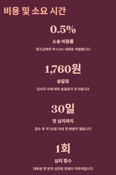 - 인지대(청구금액의 약 0.5%), 송달료(당사자 수 × 10회분, 약 10만 원대)
