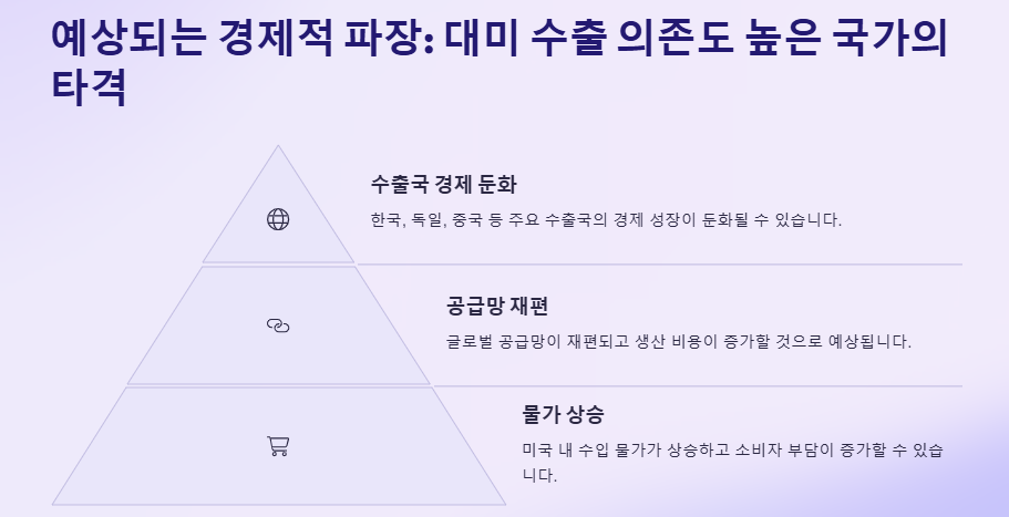 - 보호무역주의 확산: 미국의 상호관세 정책은 다른 국가들에게도 보호무역주의를 강화하는 명분을 제공하고, 유사한 형태의 무역 장벽이 확산되는 "관세 도미노" 현상을 초래할 수 있습니다. 이는 글로벌 교역량 감소와 세계 경제 성장 둔화로 이어질 위험이 있습니다.